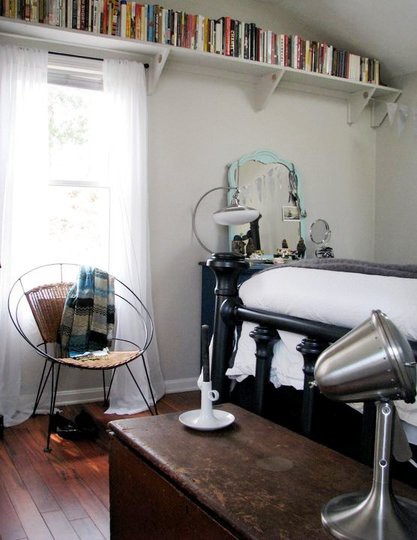 התמונה הבאה מהווה לדעתי את תמצית האחסון החכם והמעוצב לחדר קטן, ומשמשת לי השראה בתכנון חללים דומים. כל המרכיבים לתכנון נכון קיימים כאן: תקרה נמוכה- שימו לב לתאורה שמוקמה על הקיר, כוורת פשוטה ונכונה בגודלה עם סלסילות שמסתירות את כל הבלגן, מידוף מרחף, ריהוט קליל בהיר, והתמונות על הקיר יוצרות אשליה של גובה (והשוס- רובו של החדר מאיקאה!)