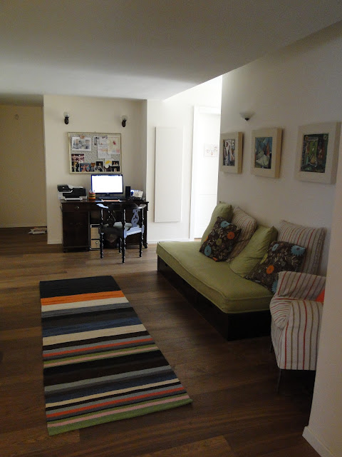 פינת משפחה בעיצובי. המרבץ נבנה על במה עם מגירות המשמשת לאחסון אלבומי תמונות, ספרים ושמיכות להתכרבלות לצפיה בטלוויזיה. בחללים בהם מקומות האחסון מוגבלים, אני ממליצה להשתמש בבמה עם מגירות ולא בספה רגילה.