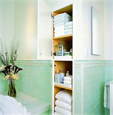 יש לכם שרותי אורחים קטנים ואין מקום לארון למגבות? הקיר הוא בהחלט פתרון. במקרה הזה מדובר בגלילים מחומר קשיח שחוברו לקיר ובתוכם מגבות מגולגלות. ניצול נכון וחכם של הקיר.
