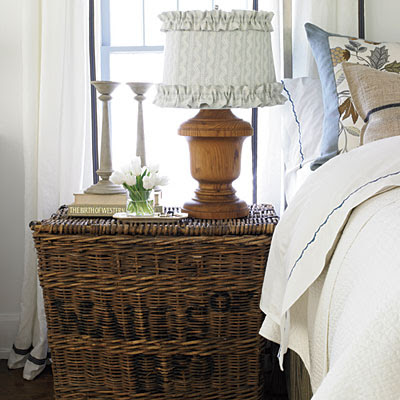 שידות הצד לא חייבות להיות סטנדרטיות. סלסלת קש קלועה ובתוכה שמיכות הקיץ למשל, מאפשרת אחסון גדול יותר משידת המגירות שאנו מכירים. (אני ממליצה להוסיף בד יפה מסביב בחלק העליון בכדי ליפות את הסלסילה).