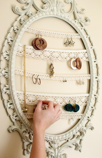 | מסגרת של איקאה, ספריי צבע, פסי תחרה. מסגרת בתחפושת של מתלה תכשיטים www.kreativenostivana.wordpress.com