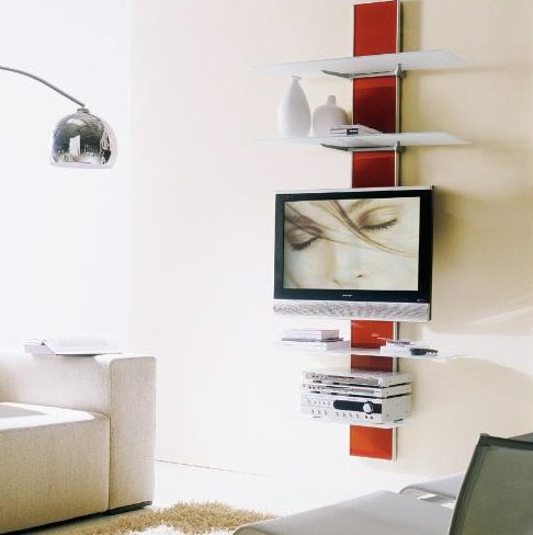 למי שמחפש "לצאת מהקופסה" בעיצוב הקיר, הרי לכם פתרון נפלא. יחידת מדפים מעוגנת לקיר, בתוספת צבע- תמיד מבורך. יחידה הדומה לזו בתמונה אפשר לרכוש באיקאה (גללו לתמונה הבאה). אני כמובן ממליצה לצבוע אותה במקרה והיא תלויה על קיר בהיר, או להשאירה בגוון הבהיר במידה וצבע הקיר כהה. הקפידו לעגן את היחידה לקיר היטב!!! וכמובן להוציא את המדף המרכזי ולפנות מקום למסך. זהו פתרון נפלא גם להסתרת החוטים.